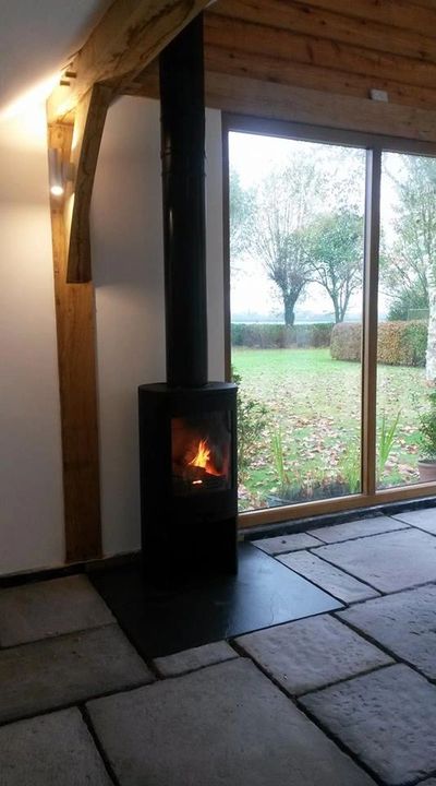 Here we fitted a insulated flue system into a newly built outhouse, complimented with a freestanding wood burning stove onto a slate hearth, sitting level with the floor. Great systems when building with wood.